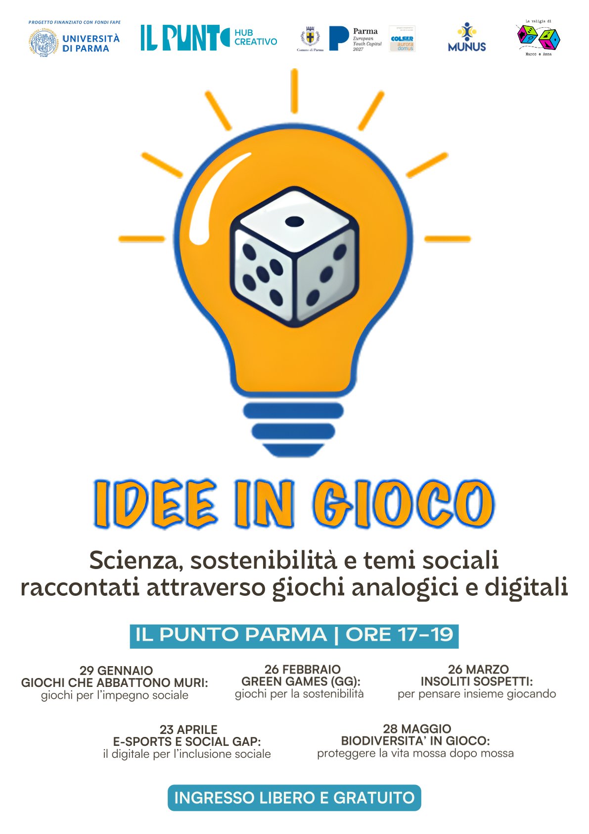 Il progetto di divulgazione scientifica e partecipazione culturale “Idee in Gioco”, è realizzato dal Dipartimento di Scienze Economiche e Aziendali dell’Università di Parma, nell’ambito del bando FAPE – Fondi di Ateneo per il Public Engagement