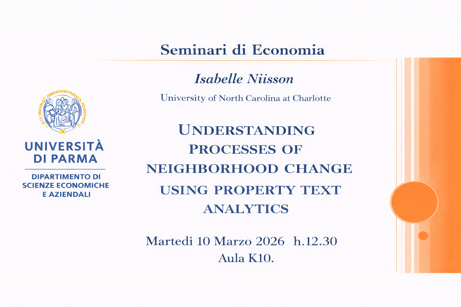 La rassegna di Seminari di Economia prosegue con la sessione primaverile. Martedì 10/03/2026 in aula K 10 dalle 12.30 alle 13,30, la dott.ssa Isabelle Nilsson, della University of North Carolina at Charlotte, approfondirà il tema “Understanding processes of neighborhood change using property text analytics”.