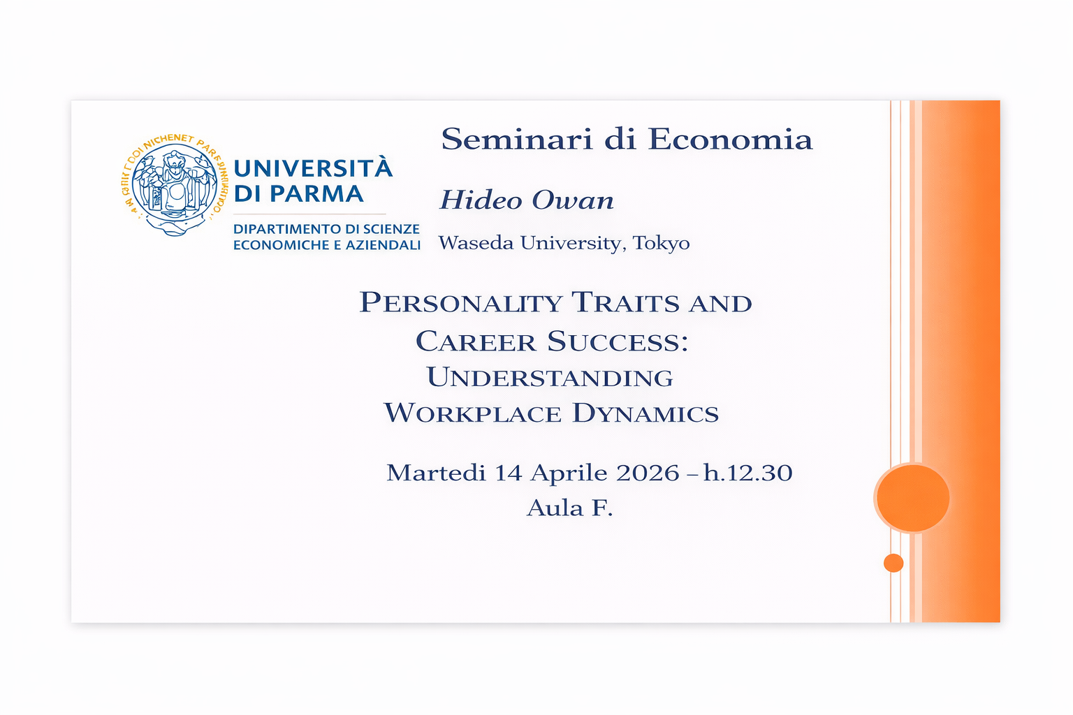 La rassegna di Seminari di Economia prosegue con la sessione primaverile. Martedì 14/04/2026 in aula F dalle 12.30 alle 13,30, il prof. Hideo Owan (Waseda University, Tokyo), approfondirà il tema "Personality Traits and Career Success: Understanding Workplace Dynamics".