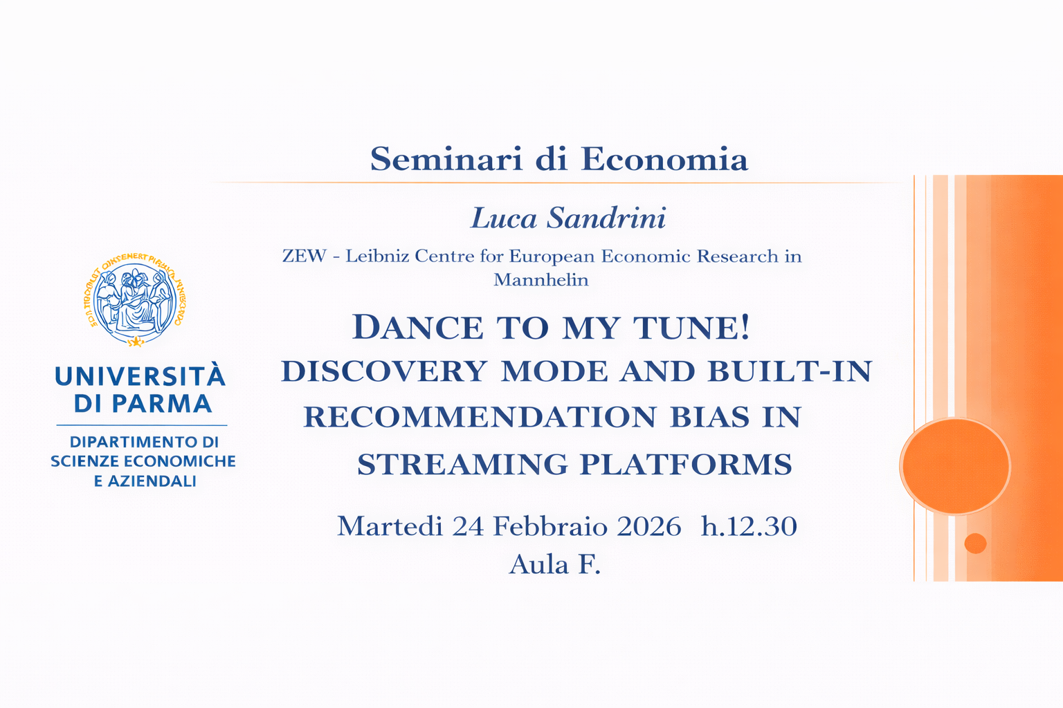 La rassegna di Seminari di Economia prosegue con la sessione primaverile. Martedì 24/02/2026, Luca Sandrini (ZEW - Leibniz Centre for European Economic Research in Mannheim) terrà il seminario dal titolo "Dance to my tune! Discovery mode and built-in recommendation bias in streaming platforms", dalle 12.30 alle 13.30 in aula F presso la Palazzina Feroldi.