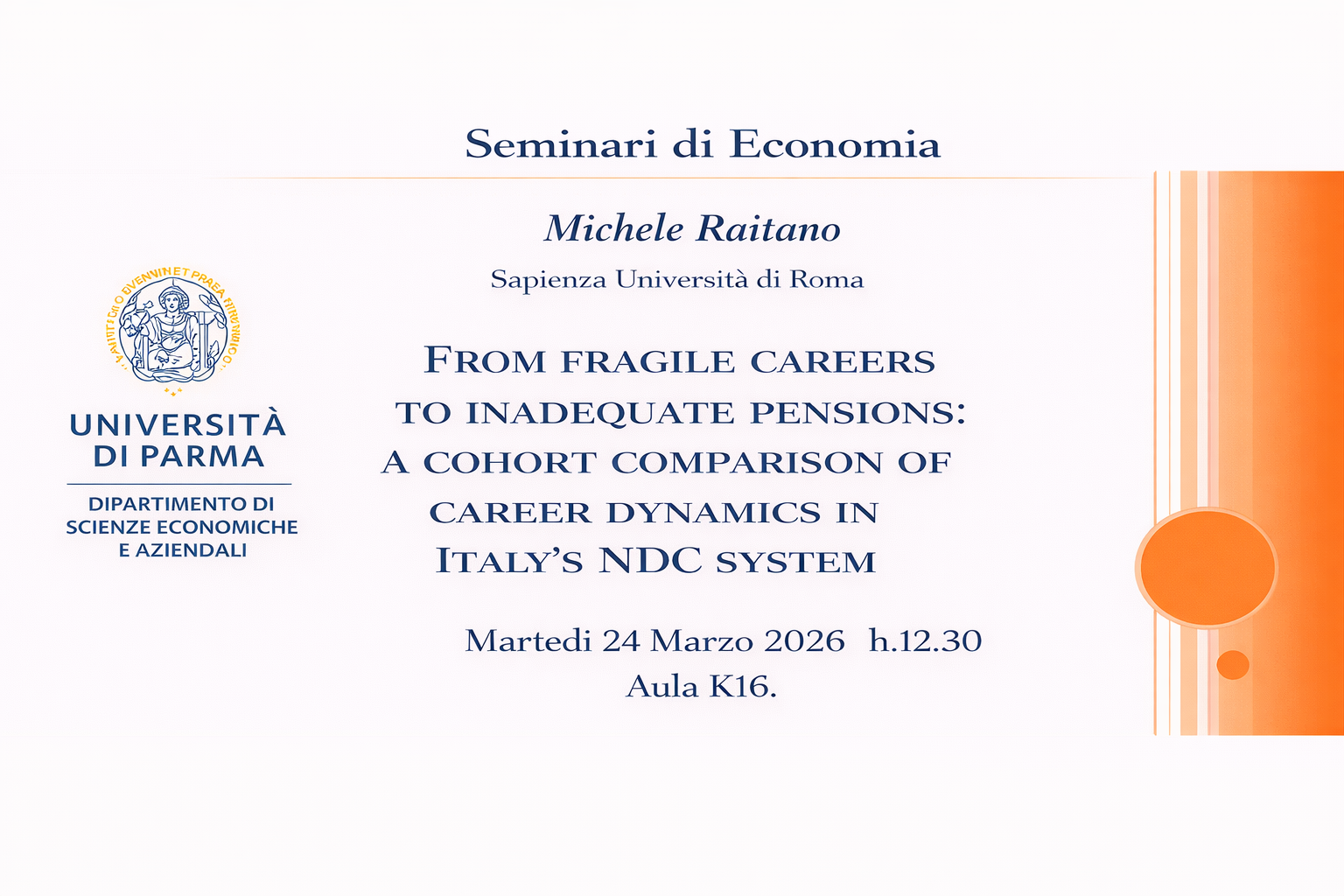 La rassegna di Seminari di Economia prosegue con la sessione primaverile. Martedì 24/03/2026 in aula K 16 dalle 12.30 alle 13,30, il prof. Michele Raitano, Professore Ordinario di Politica Economica e Direttore del Dipartimento di Economia e Diritto della Sapienza Università di Roma., approfondirà il tema “From fragile careers to inadequate pensions: a cohort comparison of career dynamics in Italy’s NDC system”.
