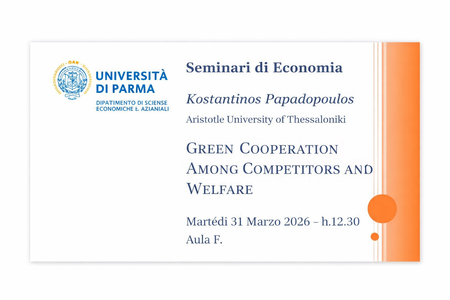 La rassegna di Seminari di Economia prosegue con la sessione primaverile. Martedì 31/03/2026 in aula F dalle 12.30 alle 13,30, il prof. Kostantinos Papadopoulos (Aristotle University of Thessaloniki), approfondirà il tema “Green Cooperation among Competitors and Welfare”.
